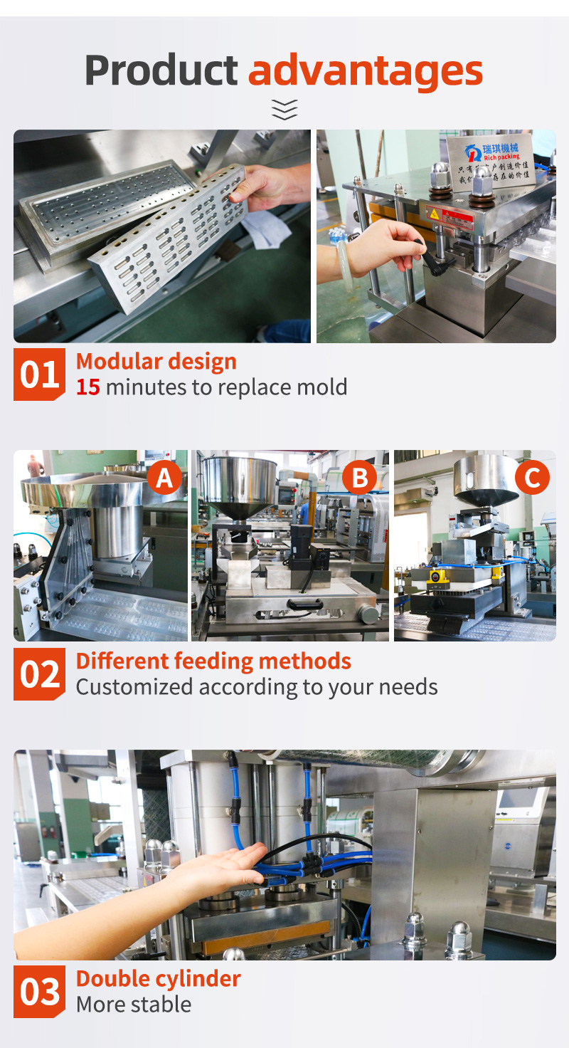 In the design stage of the machine, the convenience of the installation of the machine has been considered. The machine adopts the modular design method. The forming module, heat sealing station and cutter station of the machine are all modular design. It is very convenient to install and replace the mold. The replacement and installation of the whole set of molds can be completed in 15 minutes,The high speed 260R blister packing machine greatly improves the production efficiency and saves time.